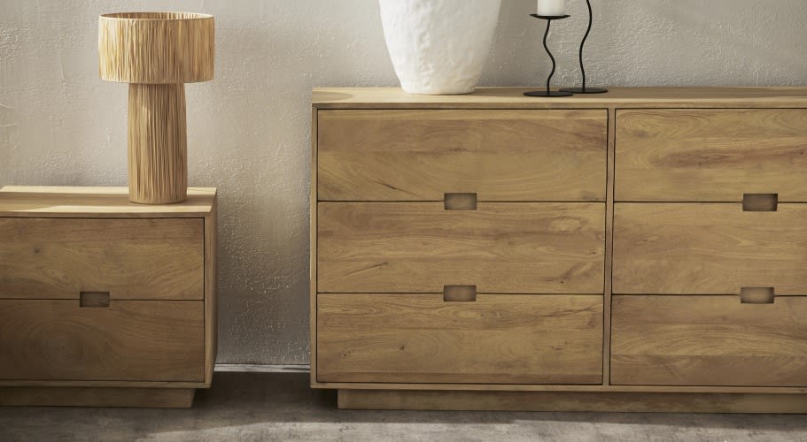 Instantly elevate the look and feel of your bedroom with the Bari Dresser. Made from solid mango wood, the minimalist streamlined design is finished with a light sandblasting effect to bring out the natural grain and beauty of the solid wood, no two pieces will be the same and there will be natural characteristics present. Complete the contemporary bedroom look with the rest of the Bari bedroom range – Bari Bedside Table and Bari Tallboy, as well as your living room with the Bari Buffet and Bari TV Unit. The Bari range also perfectly complements our Tuni and Noma range.