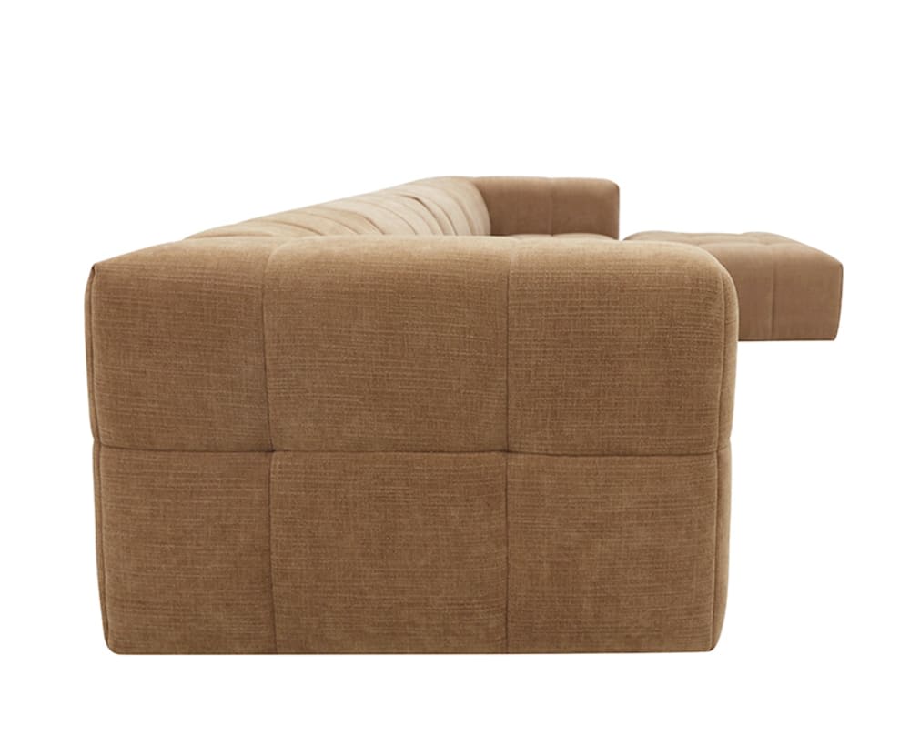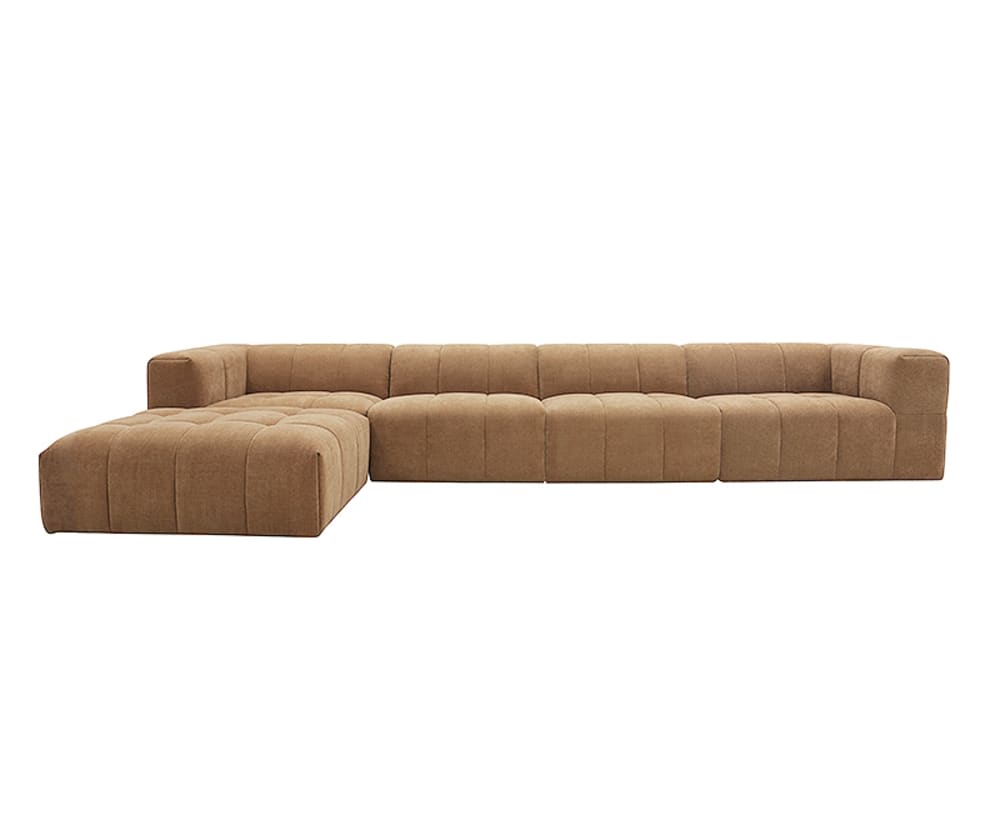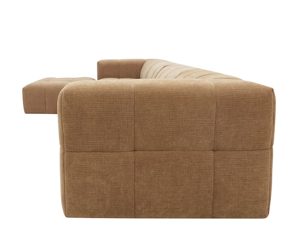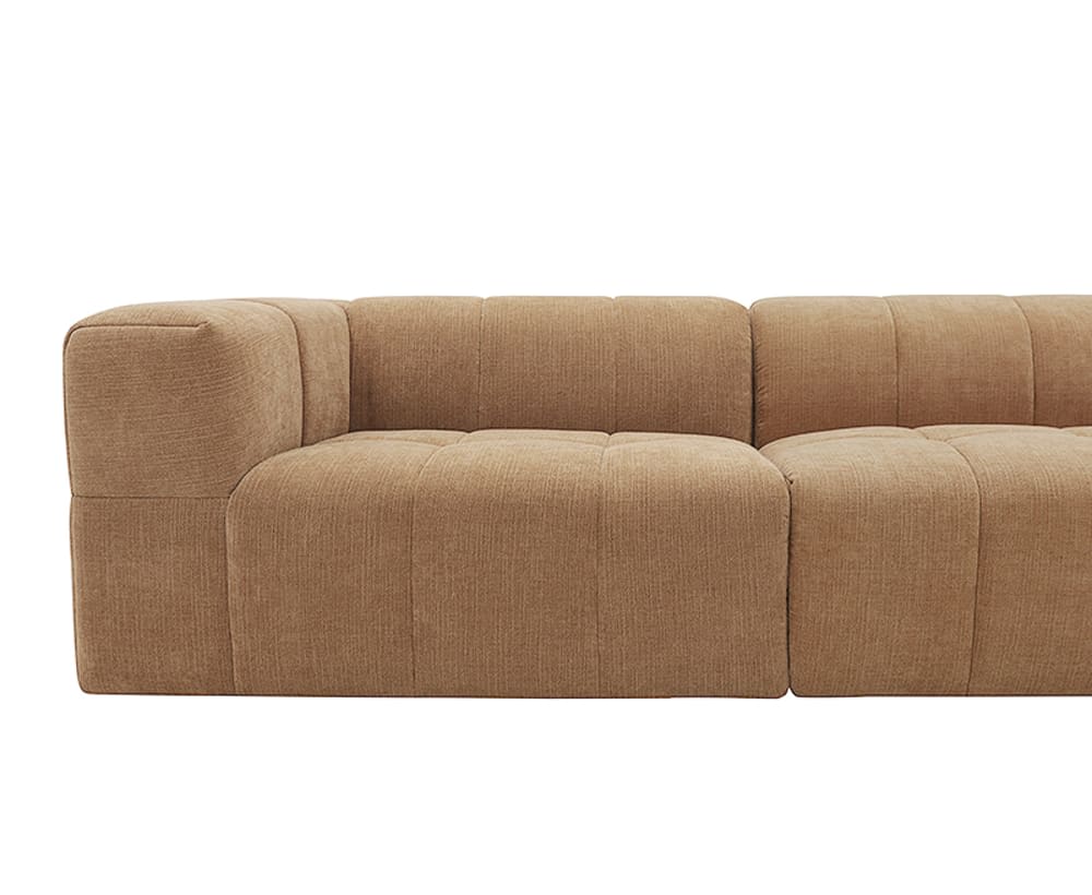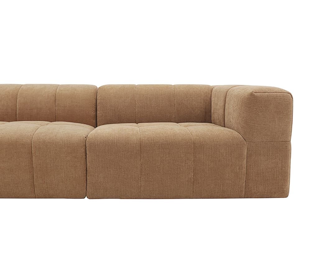 Bring comfort and elegance to your home with the Lucello sofa, showcasing a classic channel tufting throughout the seat and arms for a chic and contemporary update. Combining plush cushioning with sturdy support, you can relax with the pressure-reliving benefits of high-density foam whilst the sofa holding its shape. The soft polyester upholstery and warm hue of the sofa create a welcoming atmosphere, adding a touch of cosiness to the living room. It s stylish yet functional with its modular practicality, style it to your preference with other module pieces in the Lucello range. This is an updated model of our Lucello range.